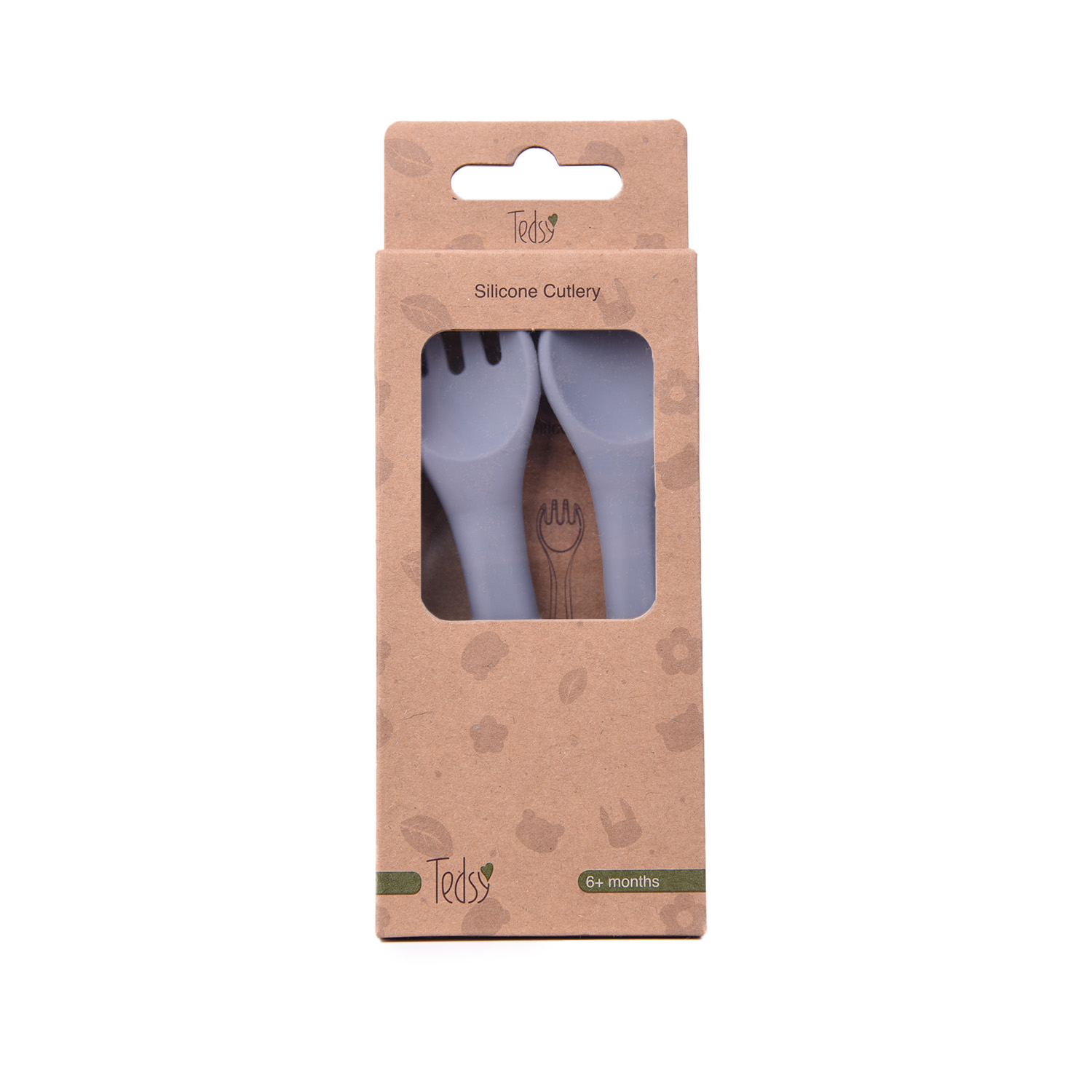 Комплект от 2 части силиконови прибори - виличка и лъжичка, подходящ за миене в съдомиялна машина, с удобни дръжки за лесно захващане. Ергономично проектиран за малки ръчички с нарастващ апетит и зараждаща се независимост.