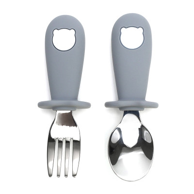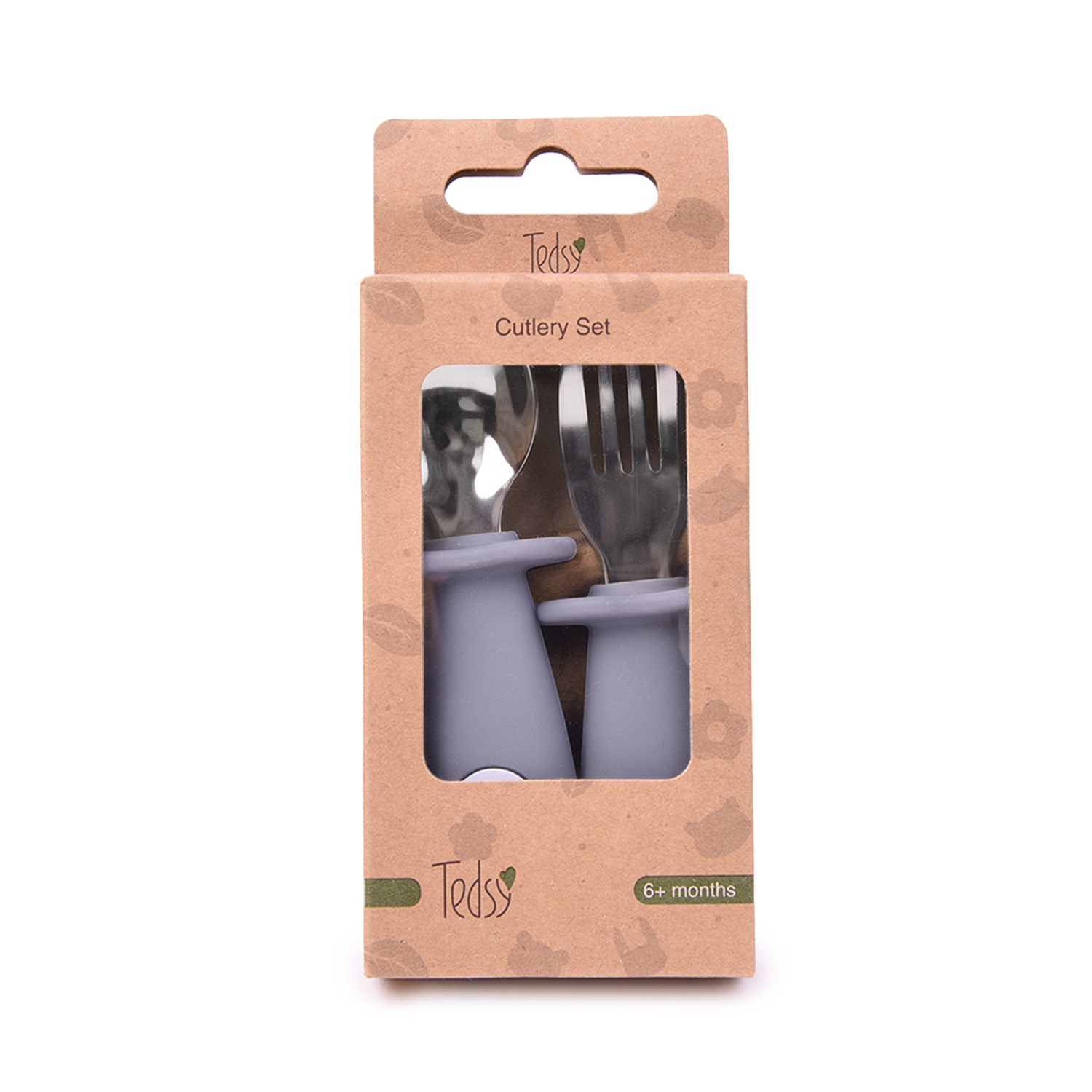 Комплект от 2 части от неръждаема стомана, подходящ за миене в съдомиялна машина, с удобни силиконови дръжки за лесно захващане. Ергономично проектиран за малки ръчички с нарастващ апетит и зараждаща се независимост.