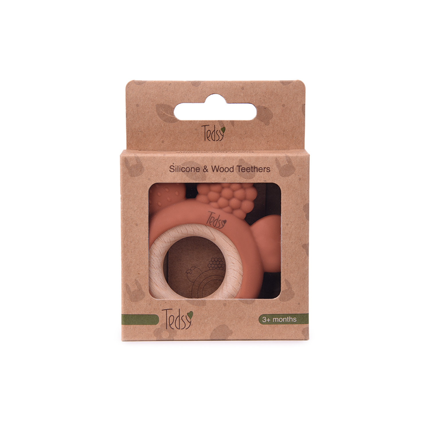 Гризалка за бебета, изработена от висококачествен силикон и дърво. Идеална за масажиране на нежните венци на бебето по време на растежа на млечните зъбки. Лесна за хващане. Спомага за развитието на фината моторика и способността на бебето да практикува хващане.