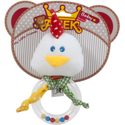 Бебешка дрънкалка петле е част от колекцията на Амек Тойс, която е изцяло произведена в България. Изработена е от висококачествен късокосмест плюш в комбинация с памучен плат, оцветен с безвредни и анти алергични багрила. Бебешка дрънкалка петле може да бъде включена още в първите игри на бебето. Погрижили сме се играчката да е изцяло безопасна, без лесноотделящи се части. С отличната си комбинация от цветове и подръкващ звук, тя ще предизвика фокусиране на погледа и неговото местене наляво и надясно. Този тип игри помагат да стимулирате правилния растеж и развитие на Вашето бебче.