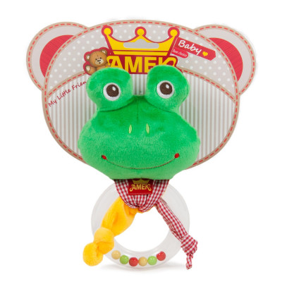 Бебешка дрънкалка жабче е част от колекцията на Амек Тойс, която е изцяло произведена в България. Изработена е от висококачествен късокосмест плюш в комбинация с памучен плат, оцветен с безвредни и анти алергични багрила. Бебешка дрънкалка петле може да бъде включена още в първите игри на бебето. Погрижили сме се играчката да е изцяло безопасна, без лесноотделящи се части. С отличната си комбинация от цветове и подръкващ звук, тя ще предизвика фокусиране на погледа и неговото местене наляво и надясно. Този тип игри помагат да стимулирате правилния растеж и развитие на Вашето бебче.