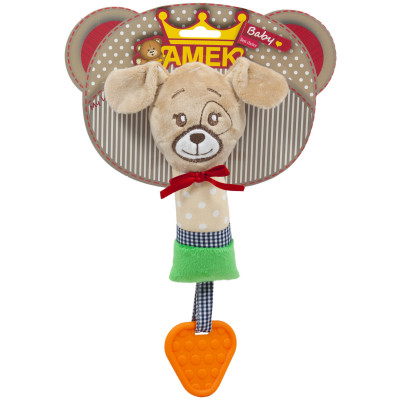Държалката кученце е средство, с помощта на което може да се стимулира правилния растеж и развитие на Вашето бебче. С отличното си съчетание от ярки цветове с различни геометрични форми и вградена дрънкалка, тя е безценна за привличане на погледа, местенето му наляво и надясно и обръщане му по посока шум. Тя е мека и удобна за хващане от малките бебешки ръчички. Дрънкалката завършва с бебешка гризалка, която ще помогне на бебечето в периода на никнене на зъбки.