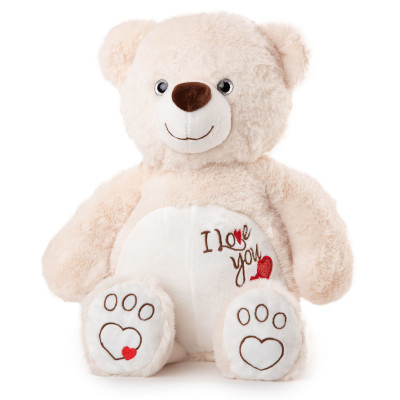 Бяло мече с бродирани сърца е изработено от висококачествен плюш. То е изключително мекичко и приятно на допир и очаква с нетърпение да попадне в твоята прегръдка. Може да изберете между два размера - 23 см и 33 см. Отговаря на европейската директива 2009/48/ЕО.