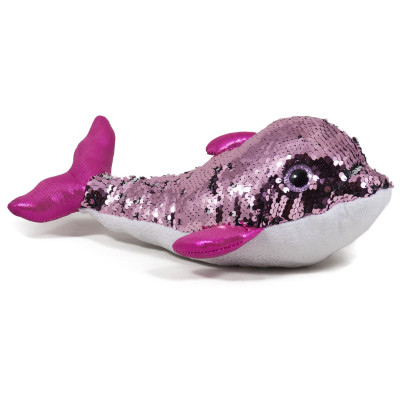 Играчката делфин с пайети е повлияна от новия тренд в Европа и като цяло в света. Изработена е от двустрани пайети. С едно движение на ръката от долу на горе пайетите се обръщат и играчката променя цвета си. Изключително актуална и интересна. Децата обожават блясъка и безкрайната игра с пайетите.