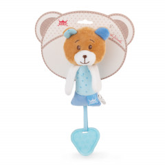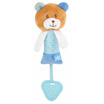 Държалка с мече е средство, с помощта на което може да стимулирате правилния растеж и развитие на Вашето бебче. С отличното си съчетание от цветове тя е безценна за привличане на погледа, местенето му наляво и надясно, и обръщане му по посока на шума на дрънкалката. При натиск на играчката тя издава бибкащи звуци. Висящият й аксесоар представлява чесалка за зъби/венци. Държалката е мека и с удобна форма за хващане от малките бебешки ръчички.