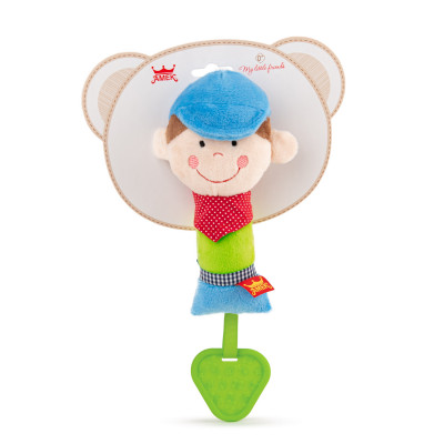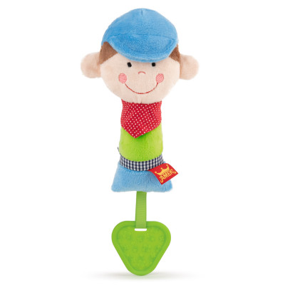 Държалката с момченце е средство, с помощта на което може да стимулирате правилния растеж и развитие на Вашето бебче. С отличното си съчетание от цветове тя е безценна за привличане на погледа, местенето му наляво и надясно, и обръщане му по посока на шума. При разклащане на играчката тя издава бибкащи звуци. Висящият й аксесоар представлява чесалка за зъби/венци. Държалката е мека и с удобна форма за хващане от малките бебешки ръчички.