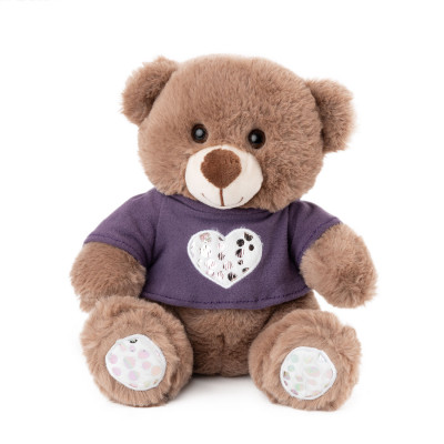Кафяво мече с лилава тениска е изработено от висококачествен плюш. То е изключително мекичко и притно на допир и очаква с нетърпение да попадне в твоята прегръдка. Може да изберете между два размера - 20 см и 25 см. Отговаря на европейската директива 2009/48/ЕО.