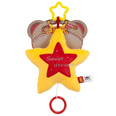 Плюшена звезда латерна /Sweet dreams/ е изработена от късокосмест плюш, оцветен с безвредни и антиалергични багрила. Различните цветове и форми развиват сетивата, въображението и моториката на Вашето бебче. Погрижили сме се да няма лесно отделящи се части, за да бъде подходяща дори и за най-малките. Чрез ринга лесно ще я закачите за бебешка количка, кошара, стол за хранене и др. При издърпване на връвчицата от звездата започва да звучи нежна, увлекателна мелодия, която спомага за успокояването и приспиването на най-милото ви същество.