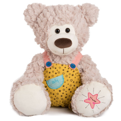 Плюшена играчка мече с гащеризон, изработена от висококачествен плюш, който е мек и приятен на допир.