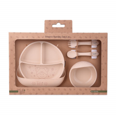 Комплектът е изработен от безопасен и хранителен материал, който е нежен към венците и растящите млечни зъби. Чинията и купата имат основа, здраво закрепена с вендузи, и са лесни за почистване. Лигавникът има 6 нива на закрепване и дълбок преден джоб, който е идеален за улавяне на падаща храна. Приборите са идеални за новия етап от храненето на вашето бебе. Комплектът е лесен за почистване. Комплектът включва: силиконова вакуумна купа и чиния, силиконови прибори и лигавник.